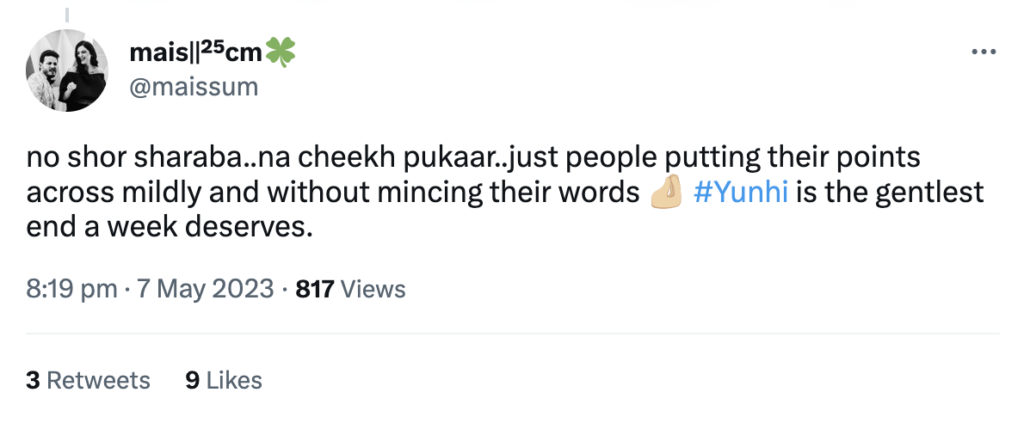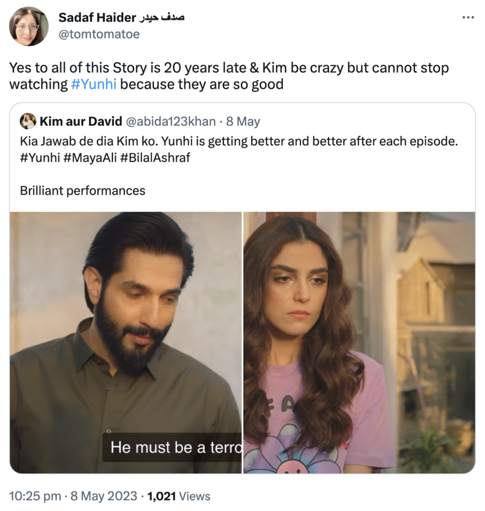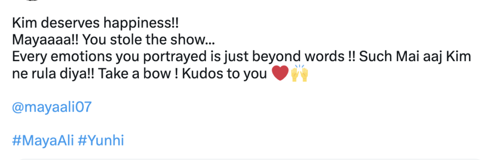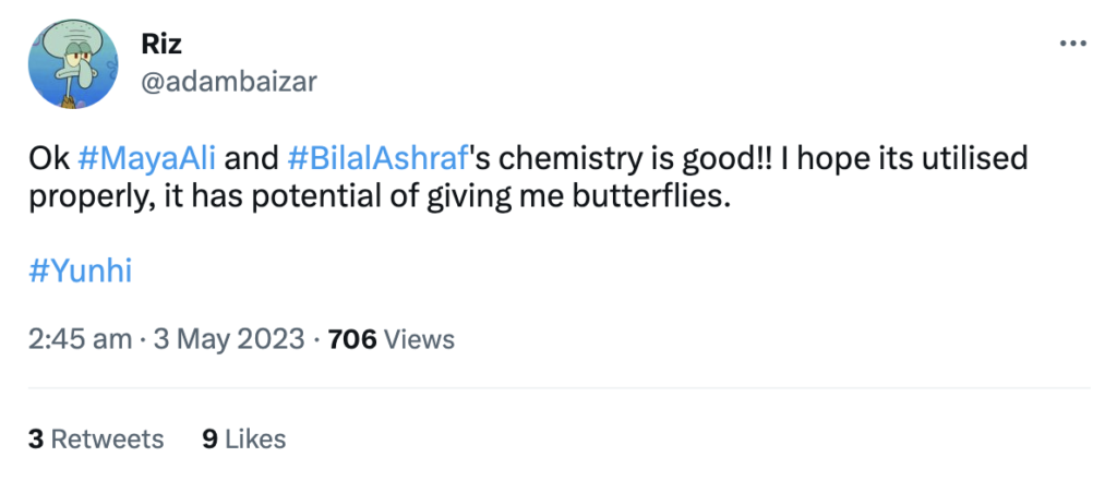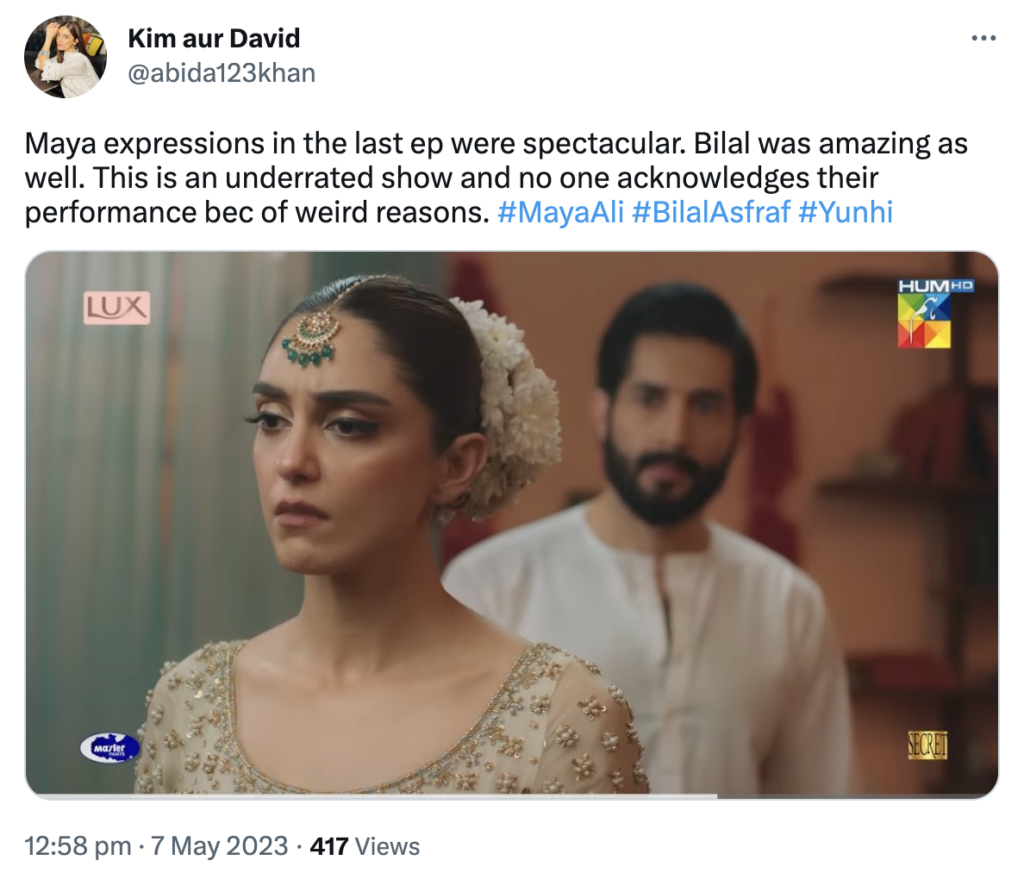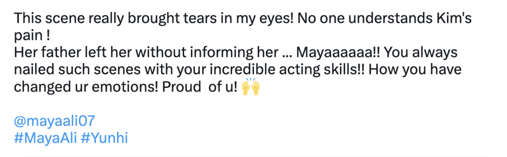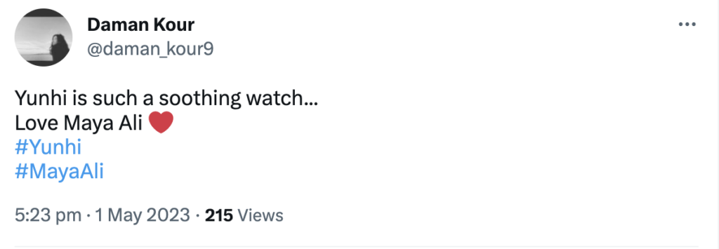 Audience are loving the cinematic and calm frame of Yunhi, as its subtle disposition is without any extravagant elements. An authentic treat to watch, it promises to be a captivating and entertaining spectacle. Its melodious OST is also a delight to the ears, featuring the phenomenal crisp duo of Maya and Bilal with their warm chemistry. Here are a few words straight from the followers of Yunhi: